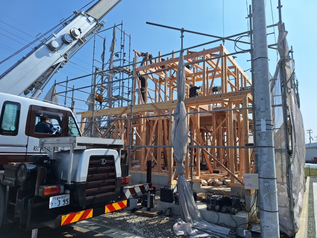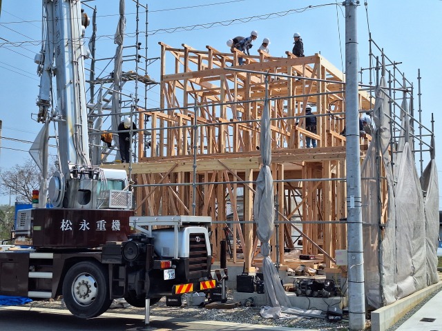 春の日差しが心地よい日、上棟が始まりました。