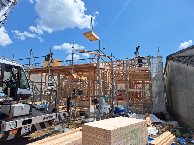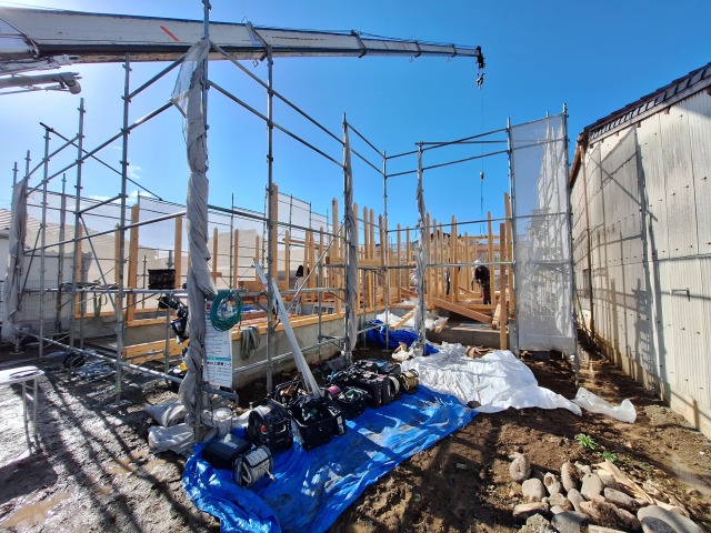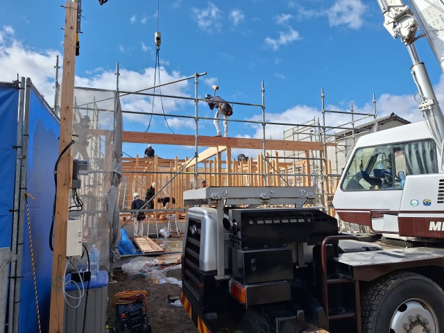 やわらかな春風に心華やぐこの日、上棟が始まりました。