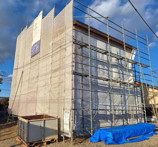 澄み渡る青空の下、上棟が始まりました。
