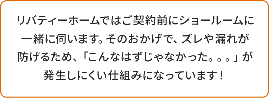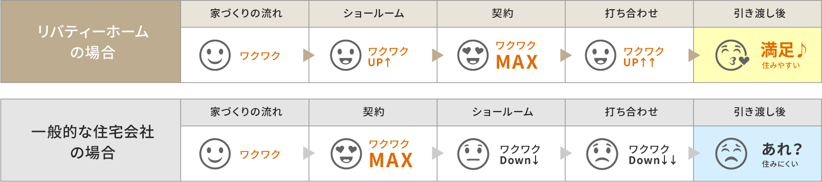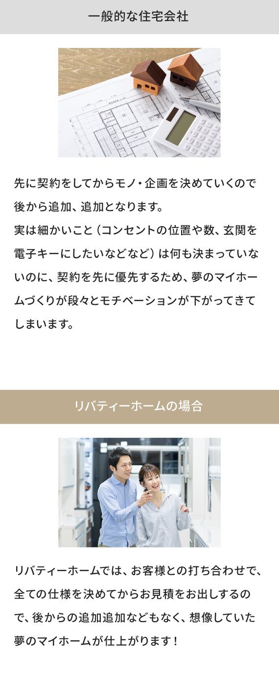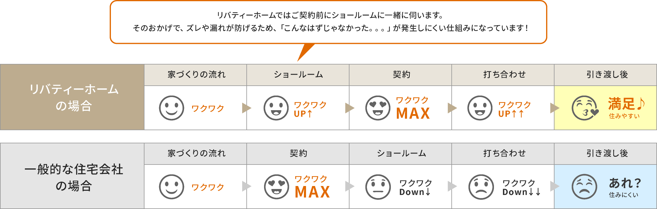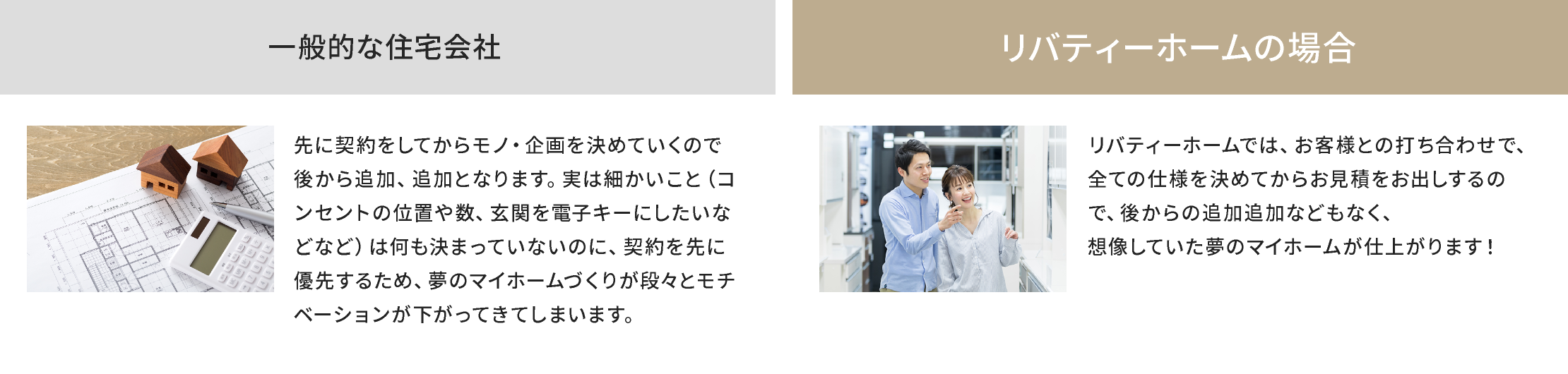 家づくりは、アバウトな内容のままご契約をする会社様が多く、ご契約後にショールームなどに見学にいき、詳細を決めていくという、一見おかしなことが当たり前になっているのが現状です。そうすると、ご契約された時は「ようし!夢のマイホームを遂に建てるぞ!」とモチベーションがピークなのが、だんだんと、「あれ?これも選べないの?」「こんなはずじゃなかったのに」が増えきて、どんどん、ワクワクがなくなりがちです。リバティーホームでは、「こんなはずじゃなかった!」のゼロを目指し、「ワクワクが高まり続ける家づくり」を目指しています。