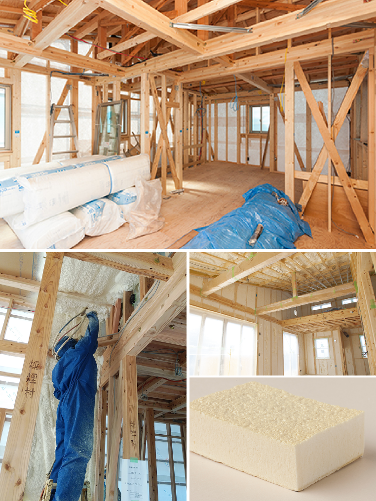 そのため断熱素材にはとことんこだわり、アイシネンを採用。アイシネンとは、従来にはない水発泡という原理を用いて開発した画期的な吹付け断熱素材です。100倍ほどに拡張(発泡)し、住宅のありとあらゆる隙間を埋めるのです。発泡する際にしっかりとした断熱層が形成されるので、今までは別々の工事が必要だった住宅の「気密工事」と「断熱工事」を同時に行うことができます。
