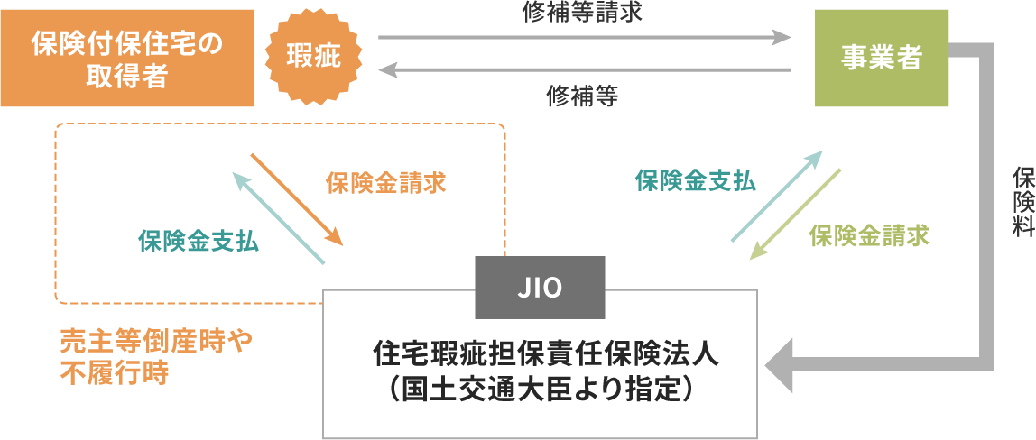 新築住宅を供給した事業者が「住宅瑕疵担保責任」に基づき「修補」を行い、JIOは「修補費用の一定割合を保険金」としてお支払します。